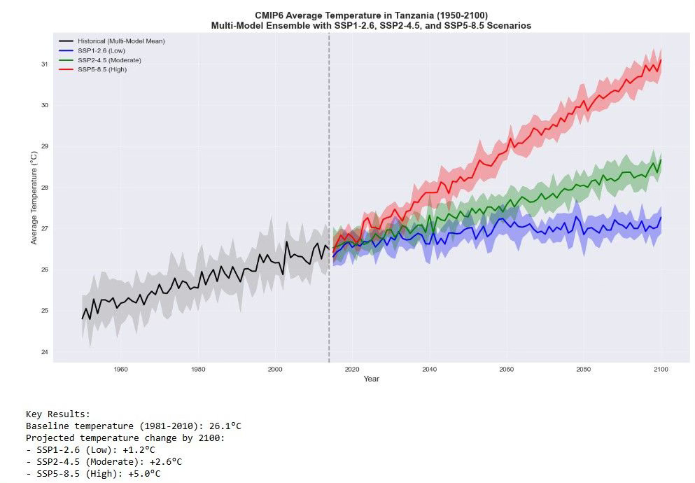 A new analysis using data from 10 global climate models shows that Tanzania’s temperatures will rise significantly by 2100, depending on how much greenhouse gases are emitted. If emissions stay low, temperatures may rise by about 1.2°C, but under a high-emission scenario, the increase could reach 5°C, pushing average temperatures above 31°C. This would lead to more extreme heat, affecting farming, health, water, and nature.