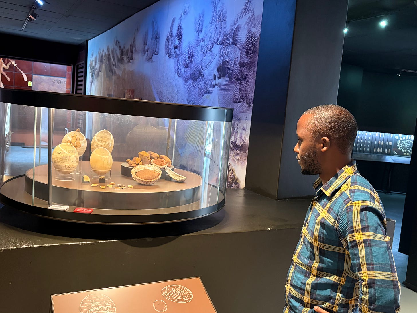 While in at Wits University last week, I visited Origins Centre Museum. In the photo, I am looking at engraved ostrich shells which are estimated to be between 100,000 and 60,000 years old that were used to carry water. They were found at Middle Stone Age sites in South Africa.