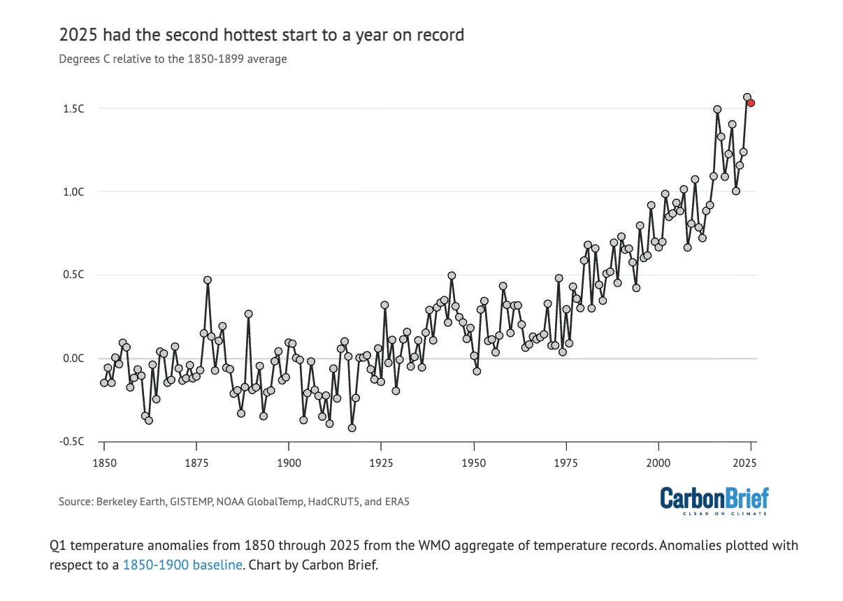 The first three months of 2025 have been unusually warm, coming in in the top-three warmest on record across all the different scientific groups that report on global surface temperatures. Read a Carbon Brief story for more global details.